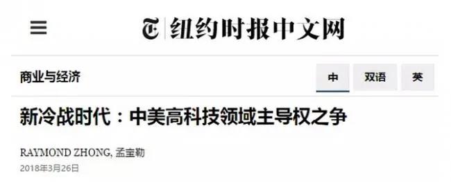 《紐約時報》用詞更狠,中美貿易戰會讓全球最先進的行業加速進入新冷戰時代,比美蘇冷戰更冷,比美日貿易戰更難解: